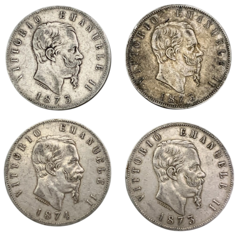 Lotto di 4 monete in argento emesse durante il Regno d'Italia negli anni 1873 e 1874. Monete di discreta qualità, a nostro parere di conservazione da qBB a BB+.