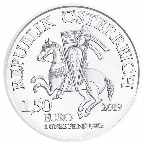 Robin Hood, il soggetto della terza e ultima moneta della serie 825° anniversario della Zecca di Vienna, è l'eroe di numerose ballate risalenti al tardo Medioevo e al primo periodo moderno. Nel corso dei secoli, la sua rappresentazione si è evoluta da fuorilegge a personaggio giusto che rubava ai ricchi per dare ai poveri. Fu il romanzo Ivanhoe di Sir Walter Scott, pubblicato nel 1820, a forgiare il classico mito di Robin Hood che prevale oggi. Che Robin Hood sia realmente esistito è incerto. Ciò che è più chiaro, tuttavia, è che la tassazione imposta al popolo inglese per raccogliere l'enorme riscatto causò violenti disordini sociali nel paese, che gli storici credono abbia portato all'origine della leggenda di Robin Hood. Mentre il rovescio della moneta presenta il "Re dei Ladri", il dritto presenta il sigillo equestre di Leopoldo V, che mostra il Duca come un comandante militare a cavallo con uno scudo e un vessillo. L'immagine originale si trova nel monastero di Heiligenkreuz, vicino a Madrid. Il dritto è comune a tutte e tre le monete della serie 825° Anniversario della Zecca di Vienna.