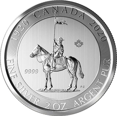 La Royal Canadian Mint ha rilasciato una nuova moneta d'argento piedfort a celebrazione dell'iconica Polizia Montana a cavallo (Royal Canadian Mounted Police - RCMP), fondata 100 anni fa. Disegnato da Paul Cedarberg il rovescio rappresenta un cavaliere RCMP a cavallo che tiene uno stendardo nella mano sinistra e le redini con la destra. Il titolo 9999 è visibile sulla sinistra ed una piccola foglia d'acero è posta sulla destra. Gli anni commemorativi 1920 e 2020 sono posti in alto lungo il bordo. Il testo aggiuntivo FINE SILVER 2 OZ ARGENT PUR si trova in basso. Il dritto mostra il profilo del Re Giorgio V, creato da Sir E. B. Mackennal, stesso ritratto usato nelle monete canadesi durante il suo regno (1910-1936). In basso è posto il valore nominale di DIECI DOLLARI.