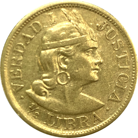 Moneta in oro che mostra sul diritto il profilo di un indios volto a destra entro la scritta circoalre ½ LIBRA / VERDAD I JUSTICIA e sul rovescio lo stemma nazionale entro la scritta circolare LIMA / REPUBLICA PERUANA ROZF e data.