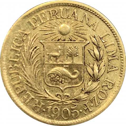 <p>Moneta in oro che mostra sul diritto il profilo di un indios volto a destra entro la scritta circoalre ½ LIBRA / VERDAD I JUSTICIA e sul rovescio lo stemma nazionale entro la scritta circolare LIMA / REPUBLICA PERUANA ROZF e data.</p>
