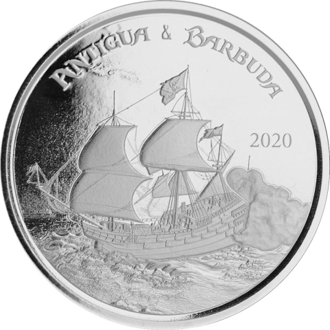 Moneta in argento inserita nella terza serie EC8 prodotta dalla Scottsdale mint in collaborazione con la Eastern Caribbean Central Bank. Mostra sul rovescio una nave pirata del XVIII secolo a vele spiegate in alto mare. A completare la scena, sono visibili dense nuvole di fumo mentre si riversano dalle bocche da fuoco della nave. Le iscrizioni "ANTIGUA & BARBUDA" sono presenti sul bordo superiore. Il dritto della moneta, comune alle otto emissioni EC8 2020, mostra l'effigie di Sua Maestà la Regina Elisabetta II entro arbusti sempreverdi che incorniciano il ritratto su entrambi i lati. Una stretta fascia circonda il bordo, che include le iscrizioni "EASTERN CARIBBEAN CENTRAL BANK" in alto, e "1 oz .999 SILVER. REGINA ELIZABETH II . 2 DOLLARI" sul bordo inferiore.