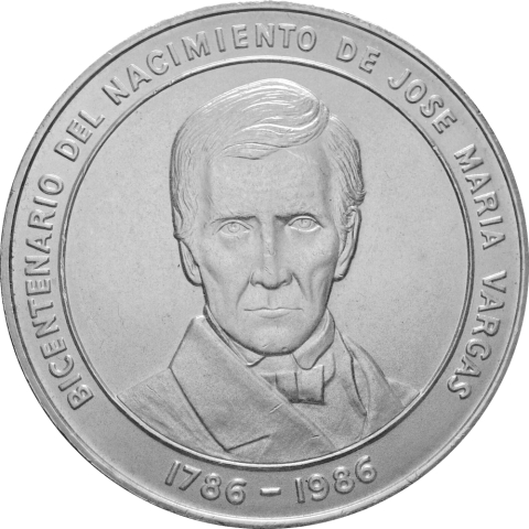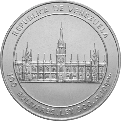 Moneta in argento dedicata al bicentenario della nascita di José M. Vargas, politico e presidente del Venezuela. La moneta mostra sul dritto la facciata dell'Università di Caracas entro la scritta circolare REPUBLICA DE VENEZUELA - 100 BOLIVARESLEY 900 31,10 gms. Sul retro è visibile il busto di José Maria Vargas entro la scritta circolare BICENTENARIO DEL NACIMIENTO DE JOSE MARIA VARGAS 1786-1986. Moneta di alta qualità, praticamente FDC.