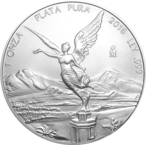 35° emissione della moneta denominata Onza messicana Libertad, una delle monete d'argento più belle e popolari del mondo. Il rovescio mostra un'immagine di "El Ángel" o Angelo dell'Indipendenza, che fu costruito nel 1910 per celebrare l'inizio della Guerra d'Indipendenza del Messico. La vittoria, la dea romana, tiene nella mano destra tesa una corona d'alloro che significa vittoria. Nella mano sinistra tiene una catena spezzata, raffigurante la libertà. Sullo sfondo del paesaggio messicano si trovano i due vulcani più famosi, Popocatepetl e Iztaccihuatl. Il dritto presenta una splendida rappresentazione dello stemma del Messico al centro. Un'aquila reale appollaiata su un fico d'India tiene un serpente nel becco e un artiglio. L'immagine è all'interno di un disegno circolare, metà del quale è costituito da una corona di olivo e quercia sul fondo e la scritta "Estados Unidos Mexicanos" sulla parte superiore. Piccole variazioni dello stemma circondano l'immagine centrale.