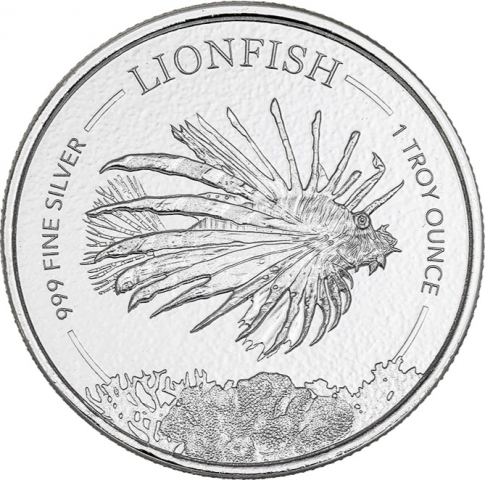 Moneta dedicata al Pesce leone dei caraibi e raffigura questo particolare animale nel suo habitat naturale, mentre nuota sopra delle alghe poggiate sul fondo marino. Lo pterois, è uno dei pesci marini più velenosi che si trovano nel Pacifico. È soprannominato il leone a causa delle sue pinne dorsali, che hanno una forma molto simile alla barba di un gatto.