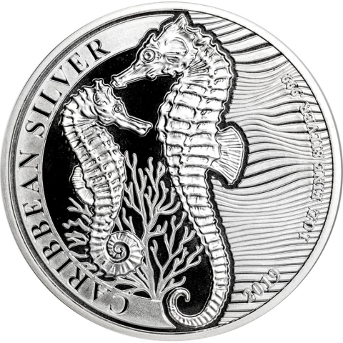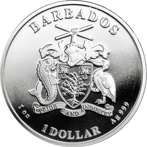 Seconda emissione della serie dedicata all'Ippocampo. La moneta raffigura una coppia di questo particolare animale nel loro habitat naturale, nello sfondo un alga. Di lato una grafica composta da onde. Il cavalluccio marino è originario delle acque tropicali che circondano le Barbados e può essere trovato più spesso nelle foreste di mangrovie e nei letti di erbe marine dell'oceano. Il disegno include anche la scritta "Caribbean Silver", l'anno di emissione ed il titolo. Il rovescio mostra lo stemma delle Barbados.