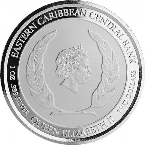 Moneta commemorativa in argento emessa dal Governo di Saint Vincent e Grenadine. Inserita nel programma numismatico EC8 delle 8 isole caraibiche, la moneta raffigura splendidamente lo stemma del paese, o sigillo nazionale, che riporta le parole "Pace e Giustizia" in latino. Il pezzo centrale è basato sullo stemma coloniale in uso dal 1907 al 1979 e presenta due donne in abiti classici romani.